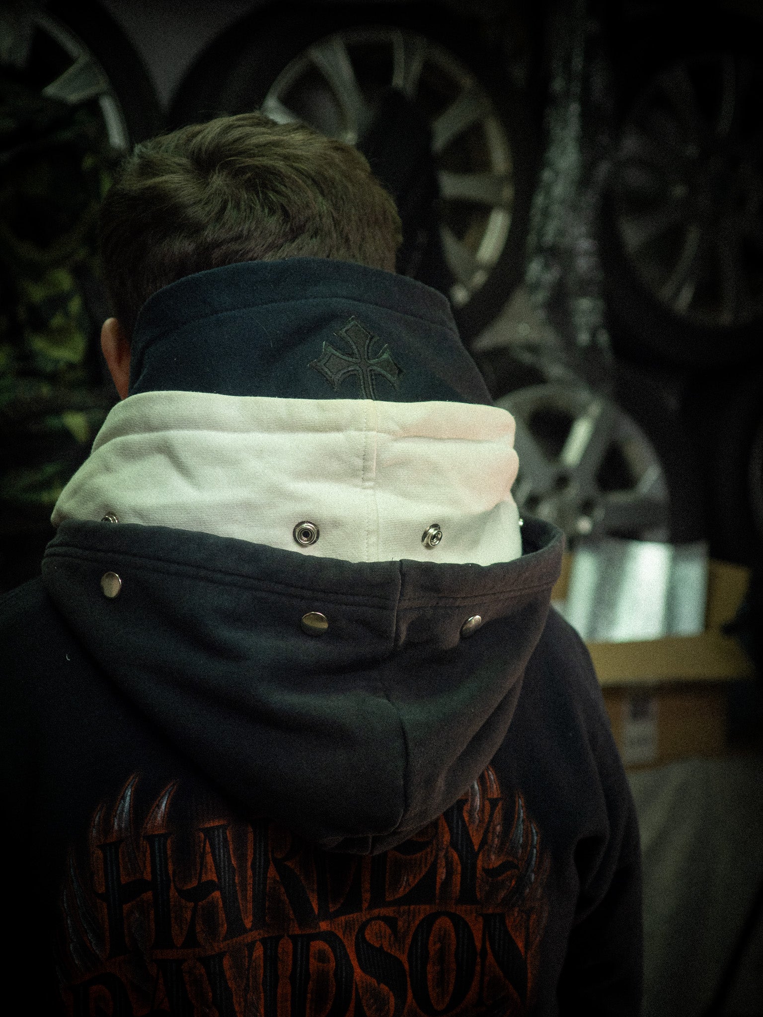 1/1 art piece z vintage Harley Davidson hoodie, vytvořena ze dvou mikin a třech kapucí.
