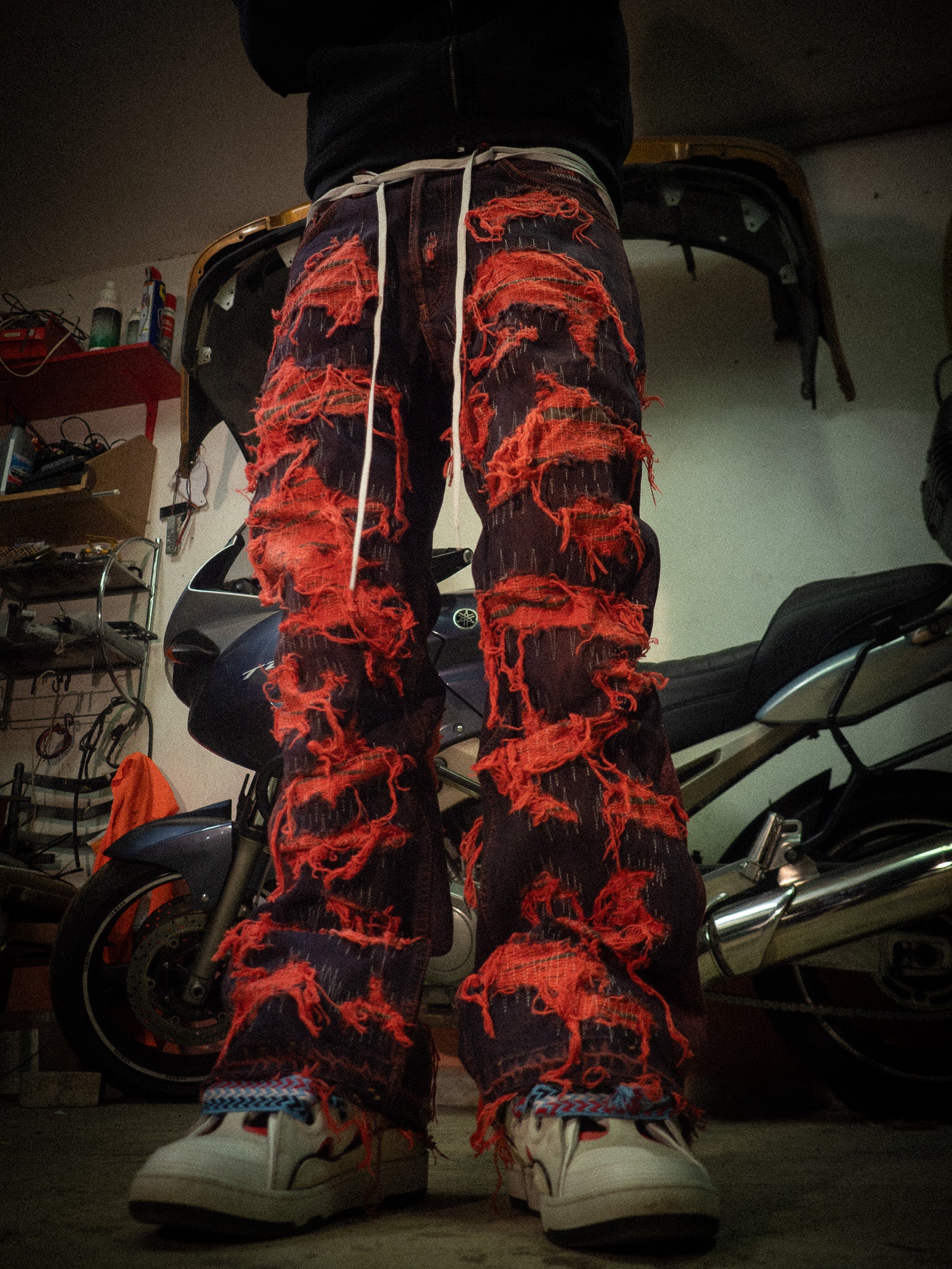 1/1 art piece s ohněm v žilách, vytvořen dlouhým procesem jedinečného trhání, prošívání a barvení v našem Cherry Dooom Studiu.